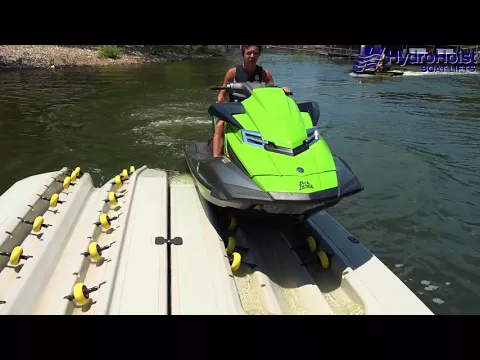 The tail of the jet ski will stay in the water and power the craft onto the dock. Once the jet ski is on the dock, the back end of the dock will float up again and lift the tail of the jet ski out of the water.
